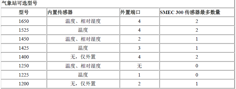 | 内置传感器可感测温度和湿度 最多4个外围传感器端口,可选择所需要的传感器 液晶屏可当前传感器数据及电池电量 从1分钟到60分钟自定义测量间隔 可记录10584条数据(使用SMEC 300时,8064条),30分钟采集间隔可储存220天 数据储存在带有故障自动防护功能的非易失性内存中; 可以使用无线网络、蜂窝技术、中转器或直连等方式连接气象站; CR2450纽扣电池供电,可维持12个月; 直边电缆或数据中转器传输数据 | |||||||||